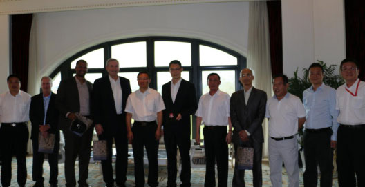 北京市丰台区冀岩区长、狄涛副区长与到访的美国印第赛事联盟代表、技术官员合影留念。印第赛事组委会秘书长胡伟先生出席并陪同